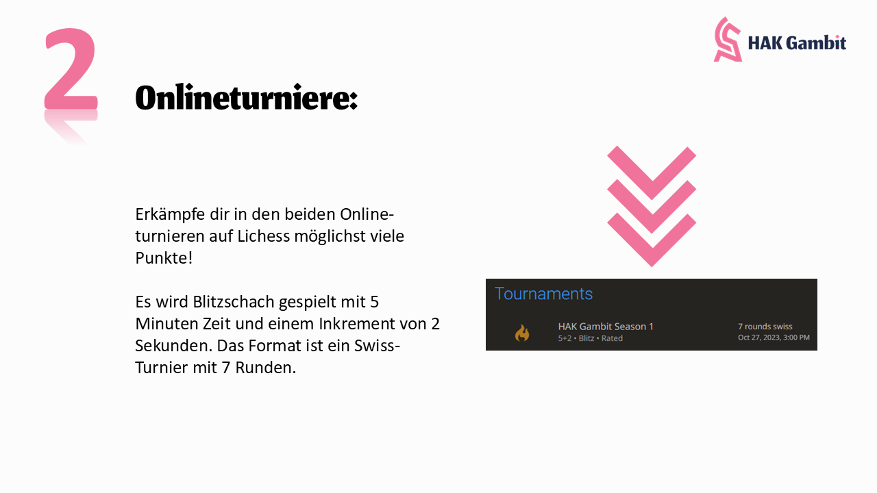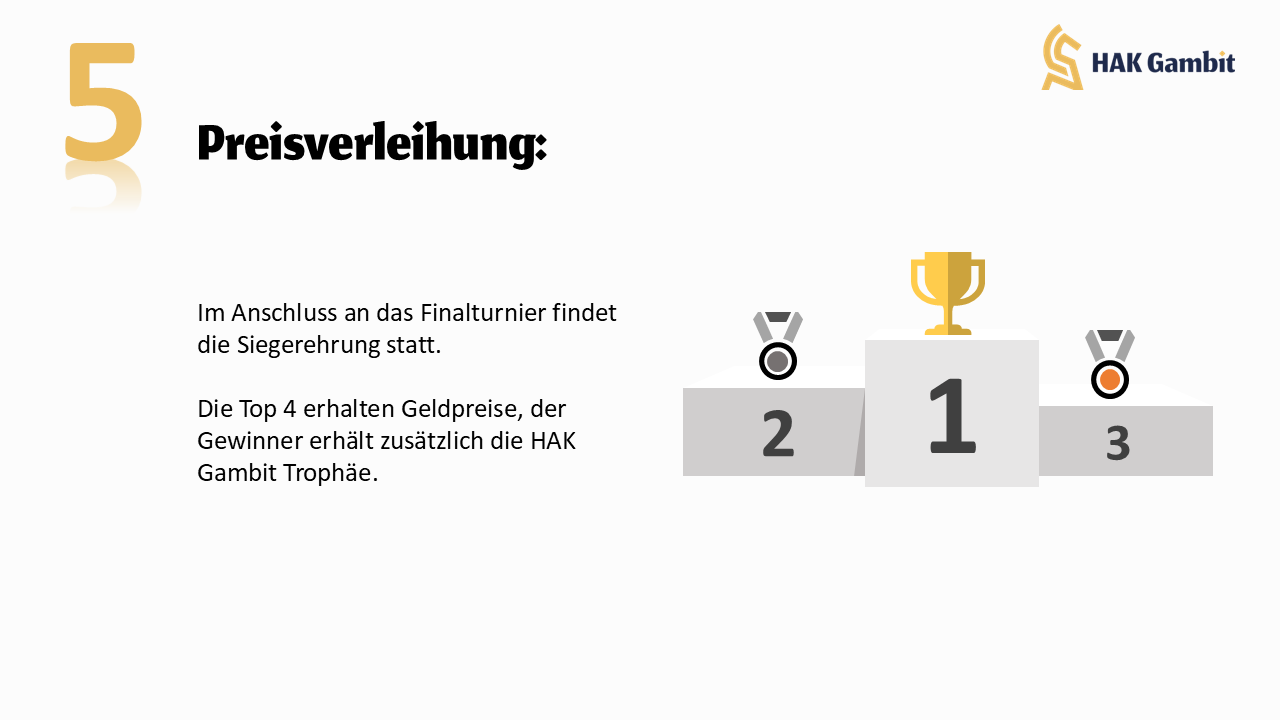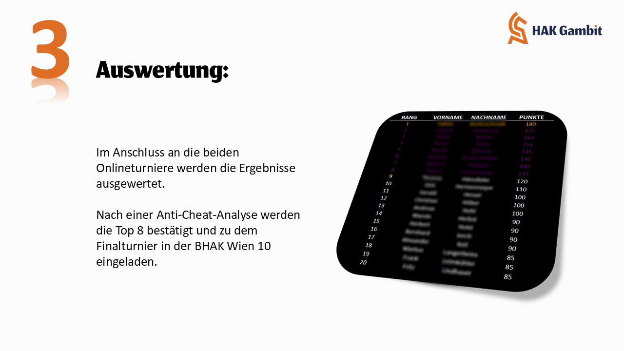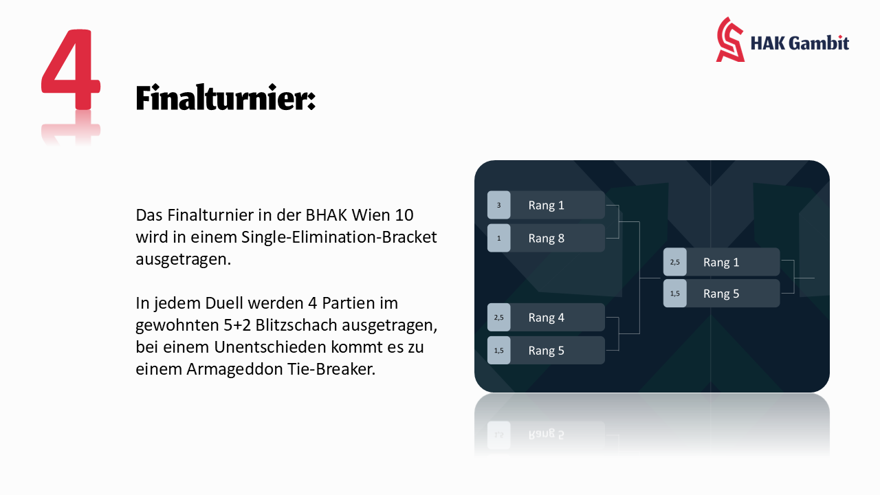 Das HAK Gambit besteht aus zwei Onlineturnieren in denen es um Punkte geht. Die Top 8 der Wertung spielen dann offline in einem Finalturnier um den Titel. Die BHAK Wien 10 wird für das Schuljahr 2025/2026 Gastgeber des Finalturniers sein!